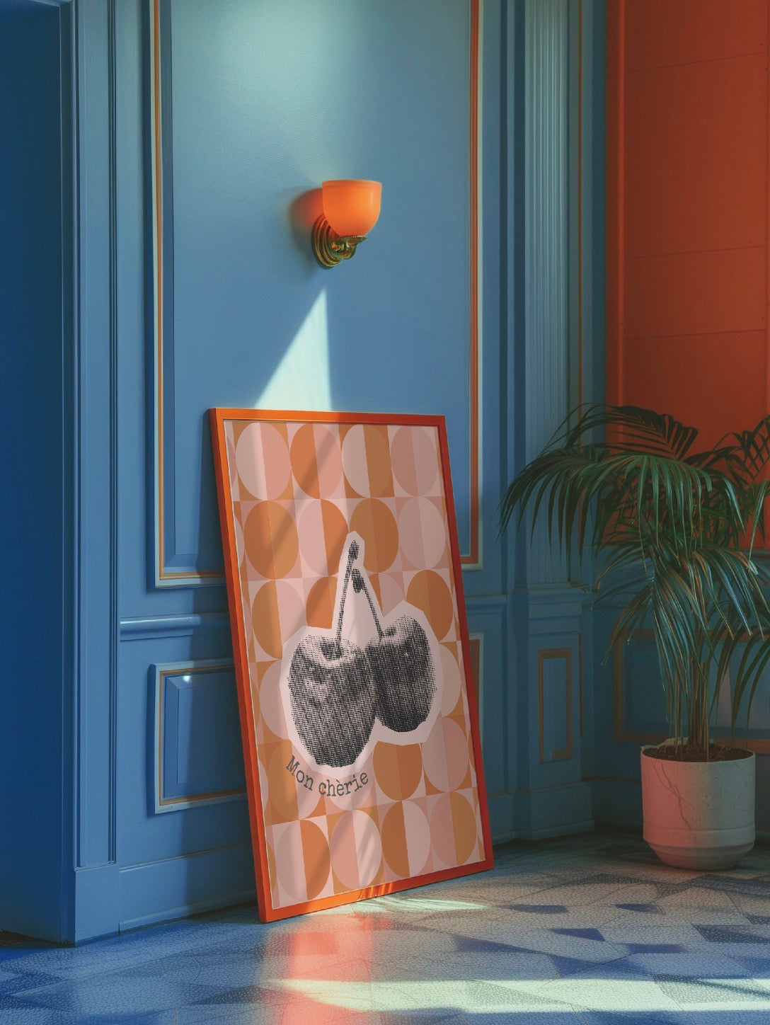 Say bonjour to bold colour and vintage charm with this Mon Chérie art print — a love letter to all things retro and romantic. Featuring warm orange and pink tones with a nostalgic wave pattern, this piece adds instant feel-good vibes to any room.