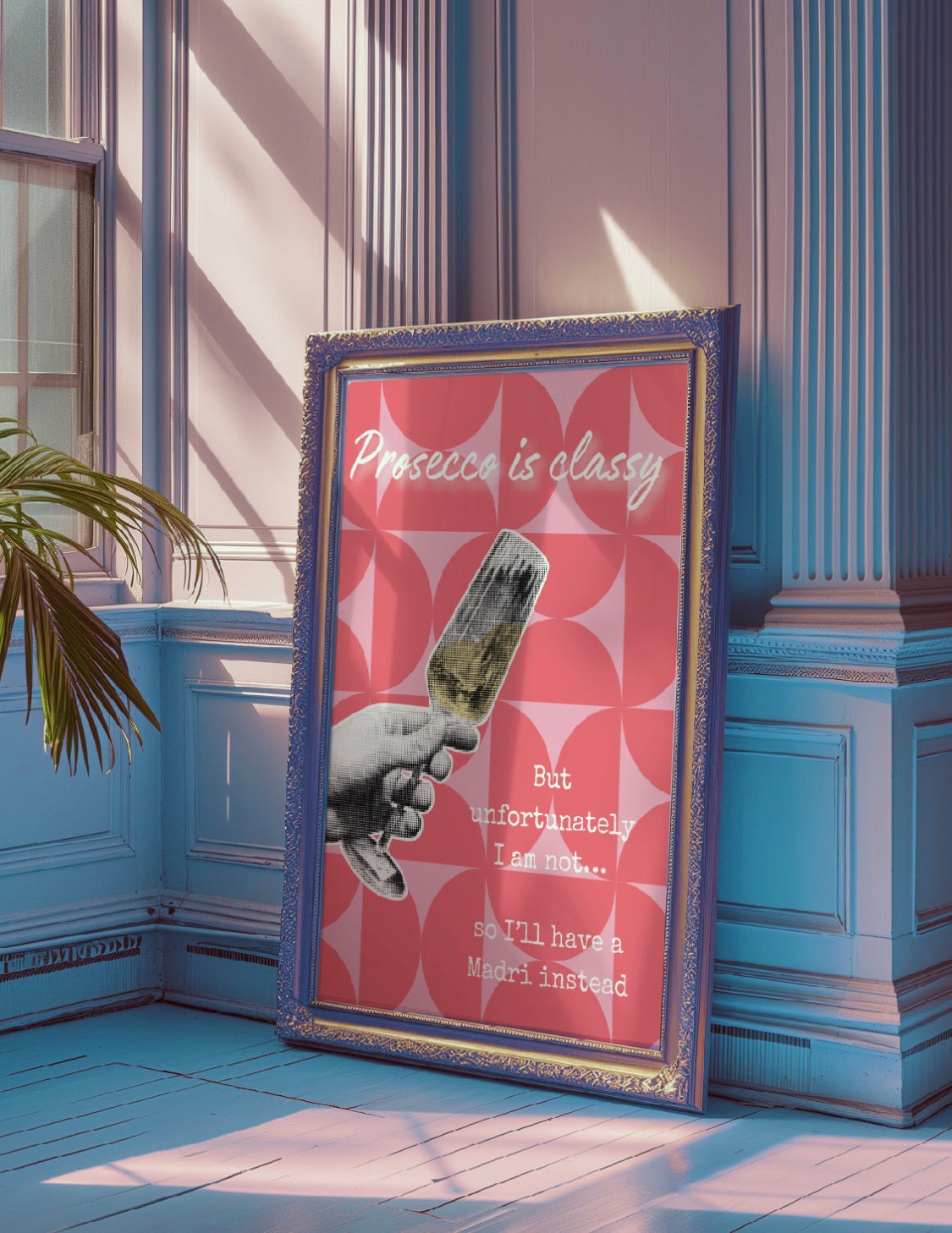 This Prosecco is classy, but unfortunately I am not, so I’ll have a Madri instead print is a love letter to low-effort glamour and good banter. Featuring bold retro typography over a warm half-circle background in contrasting dark and light tones, it’s the perfect mix of classy and chaotic.